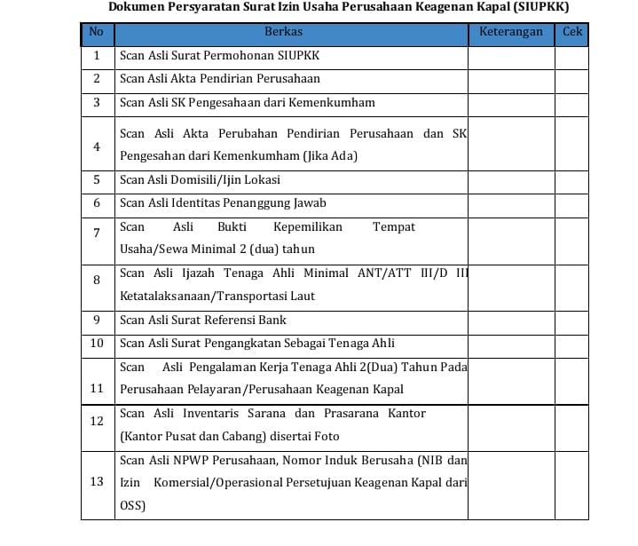 SIUPKK adalah : Surat Izin Usaha Perusahaan Keagenan Kapal perintah UU dan telah diatur Sesuai dengan Peraturan Menteri Perhubungan PERATURAN MENTERI PERHUBUNGAN REPUBLIK INDONESIA NOMOR PM 11 TAHUN 2016, Perusahaan pelayaran berfungsi sebagai perusahaan yang menghubungkan bisnis di seluruh dunia, terutama jika produk yang terlibat berukuran besar. Di Indonesia, transportasi air merupakan sarana transportasi yang dominan karena dua pertiga wilayah negara ini dikelilingi oleh perairan hub untuk negara-negara Asia Tenggara dan oleh karena itu menerima pengiriman dalam jumlah besar setiap hari, Hubungi kami pada kontak Jasa Pengurusan Siupkk, siopsus dan Siupal